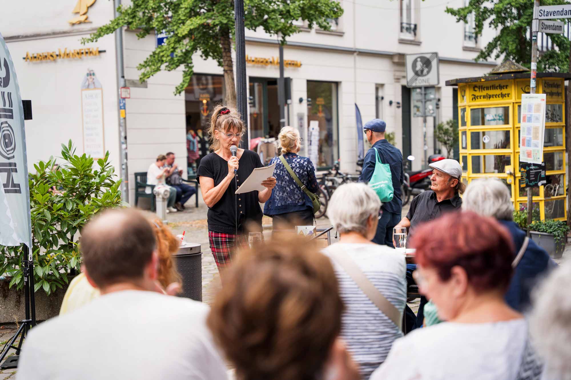 Rund um den Badestubenbrunnen am Stavendamm und an der Ecke Lange Wieren / Am Landherrnamt wurde das Quartier zur Bühne für stimmungsvolle Lesungen die zum Zuhören und Staunen einladen. Mal poetisch, mal humorvoll, mal tiefgründig und mit lokalem Bezug – die Lesungen berühren, überraschen und ließen Raum zum Träumen.